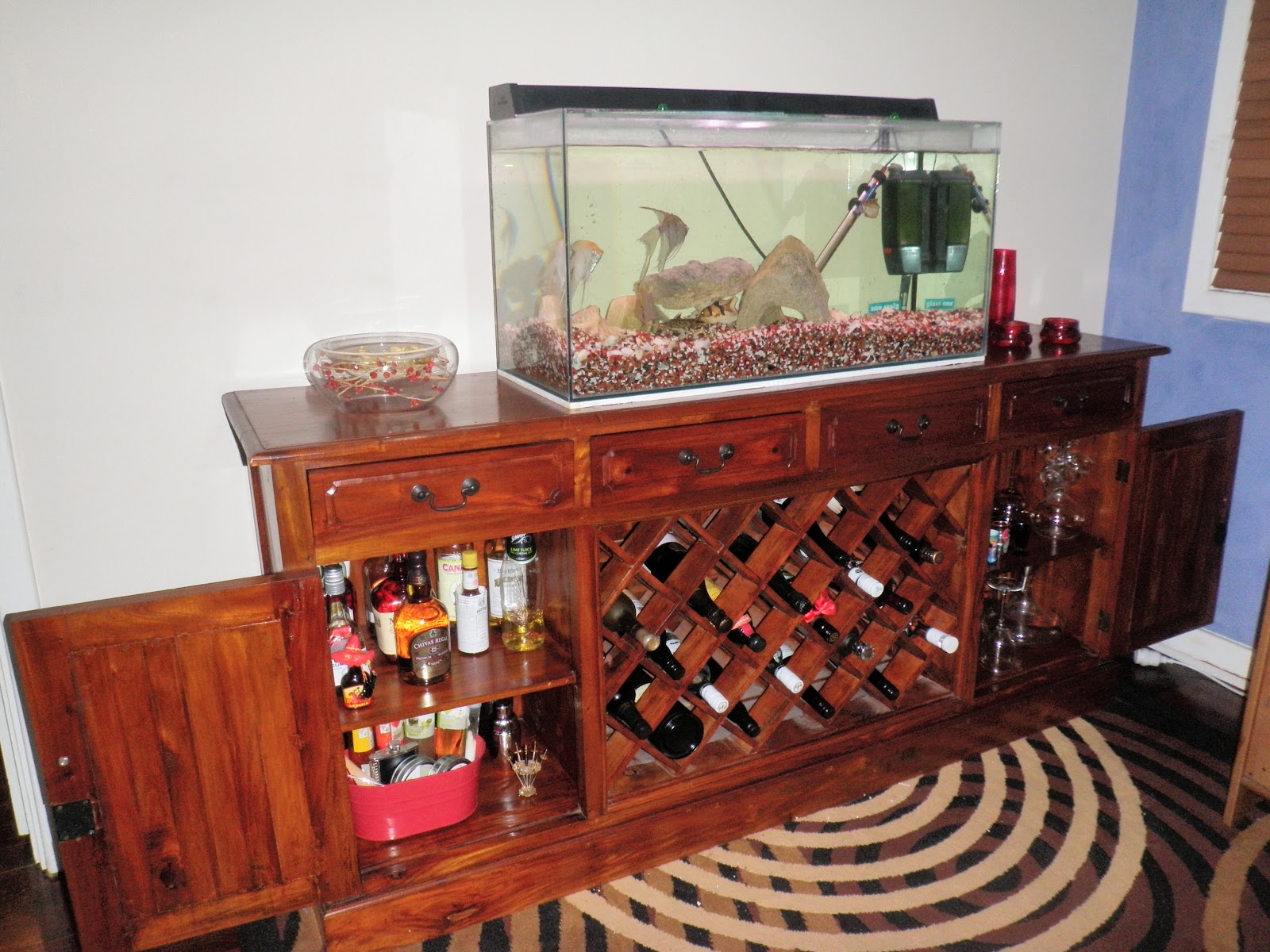 I thought I'd show you how my aquarium and wine buffet look in their new spot.